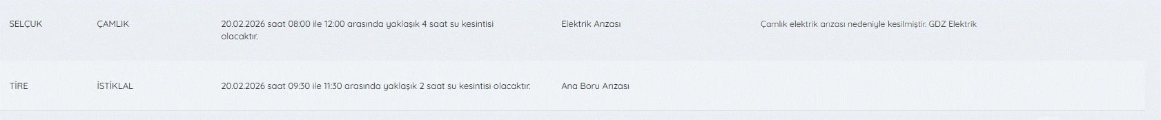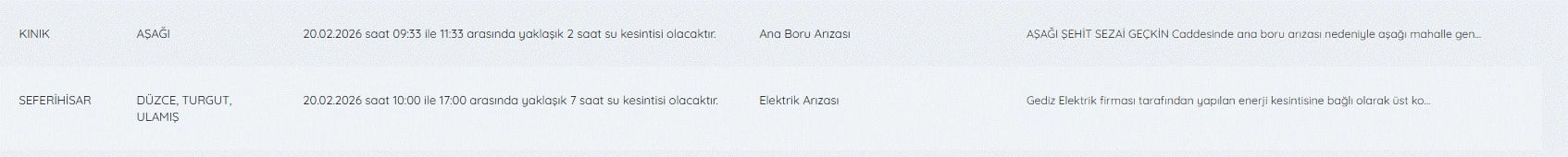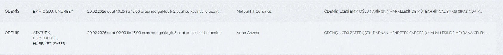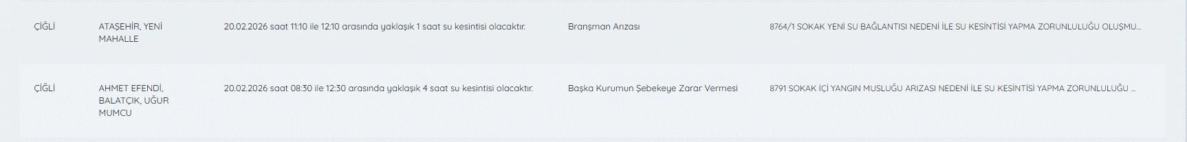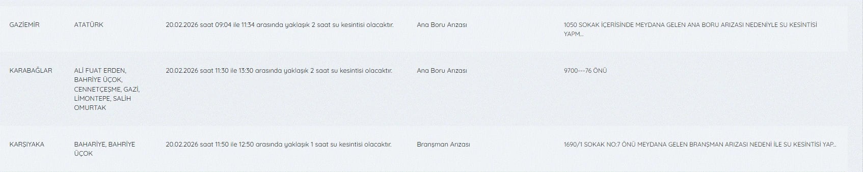 İZMİR SU KESİNTİLERİ LİSTESİ 20 ŞUBAT