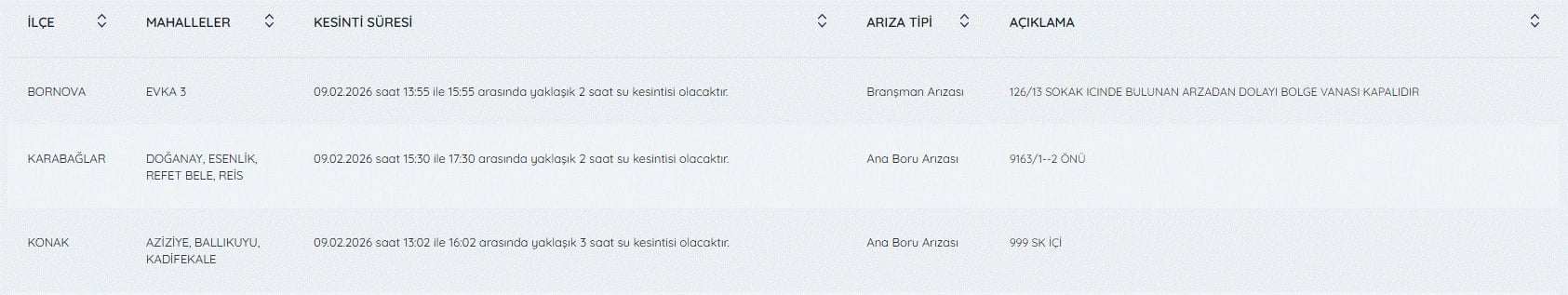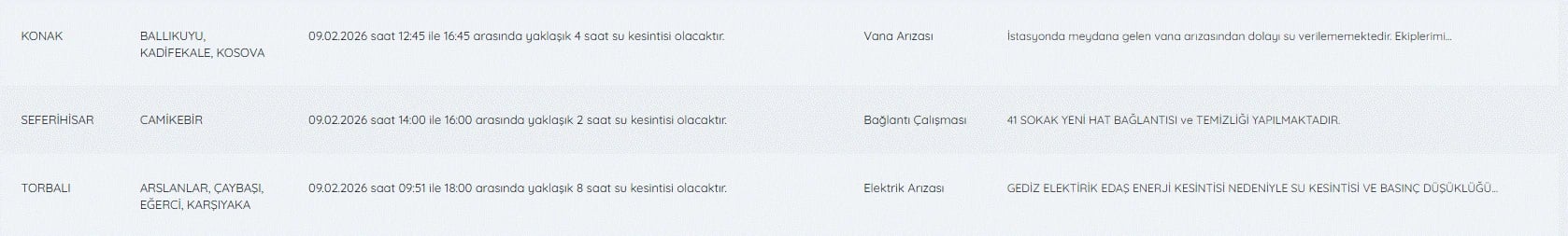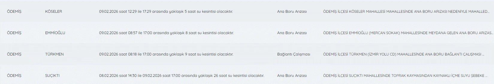 9 Şubat İzmir su kesintileri listesi detayları şöyle;