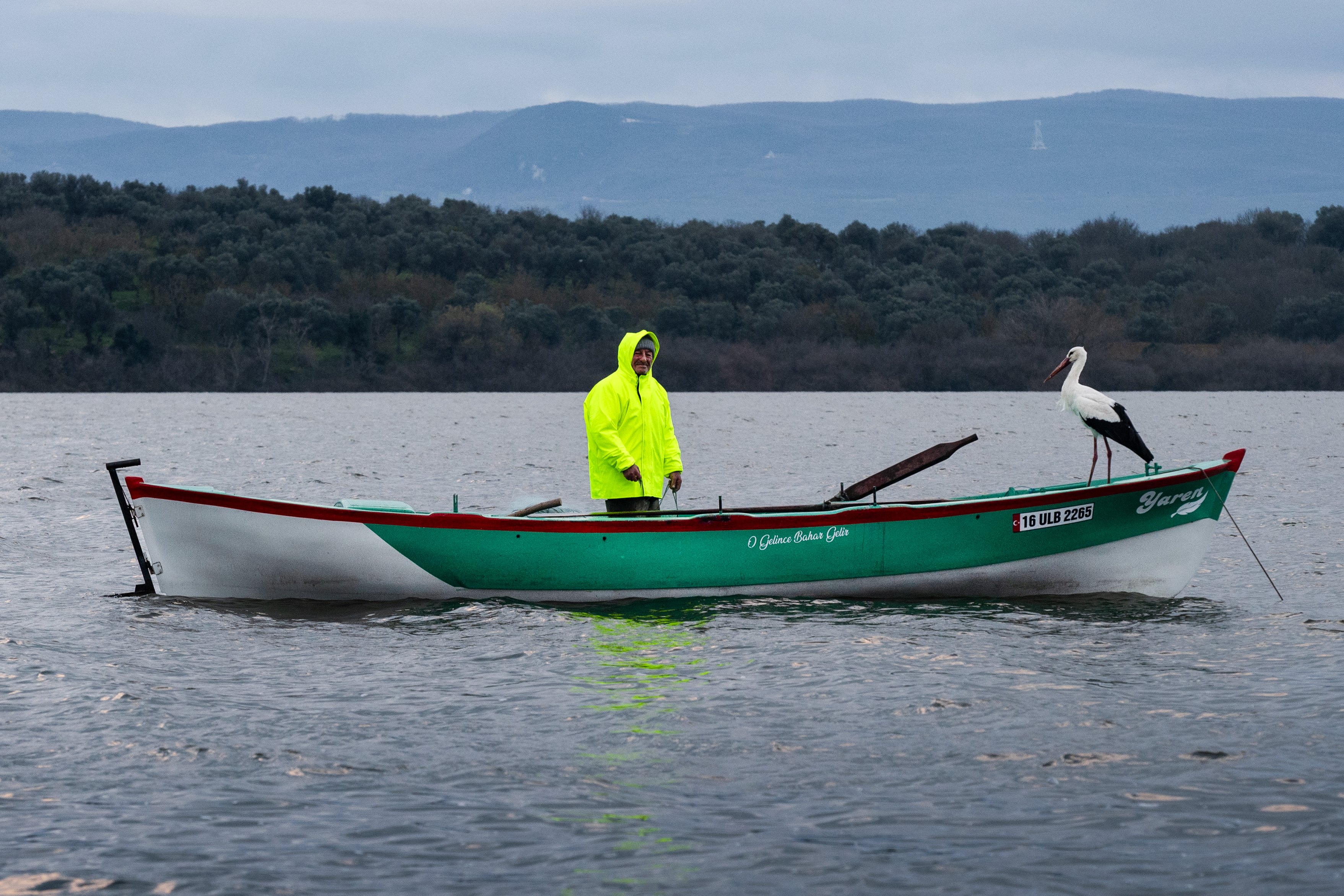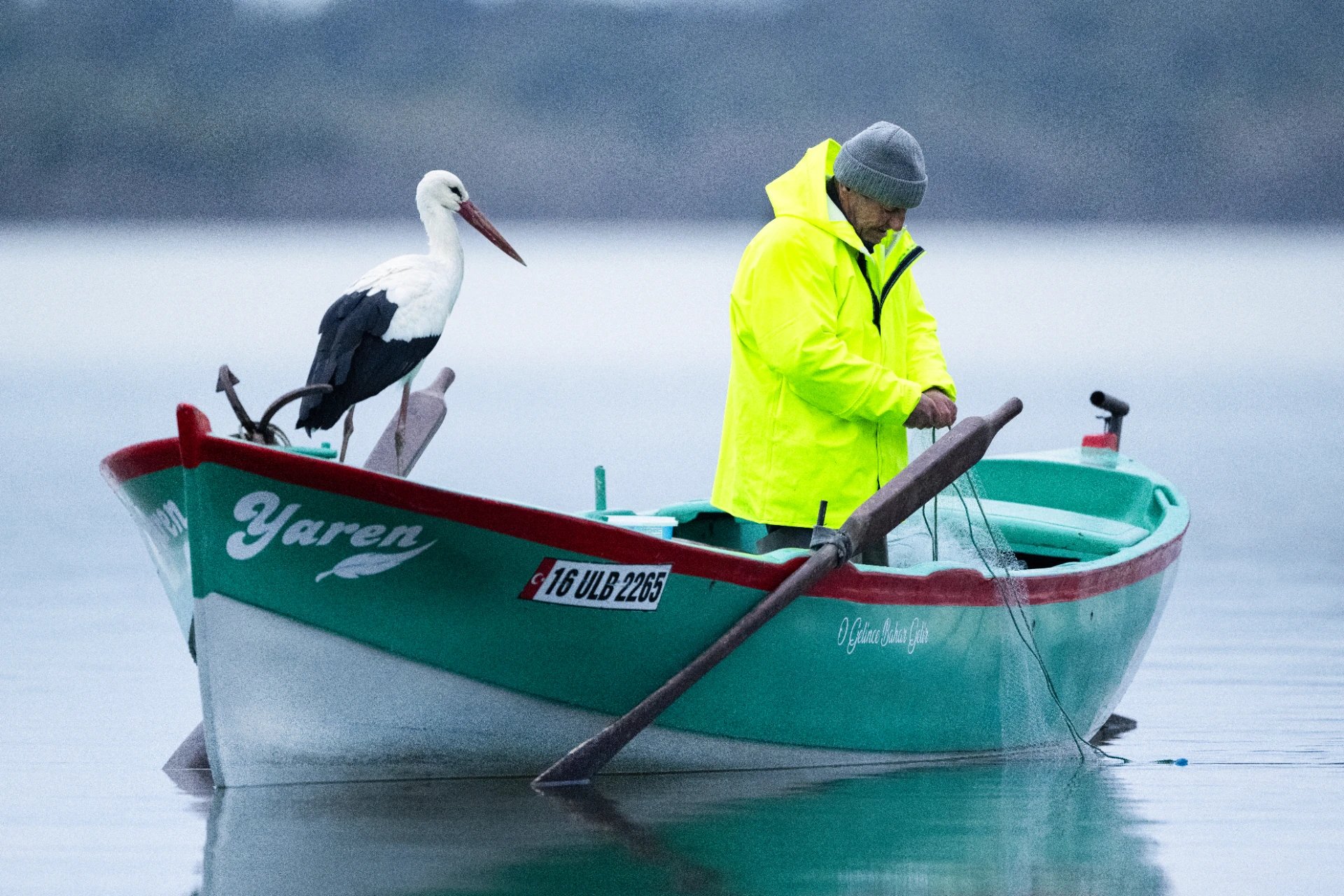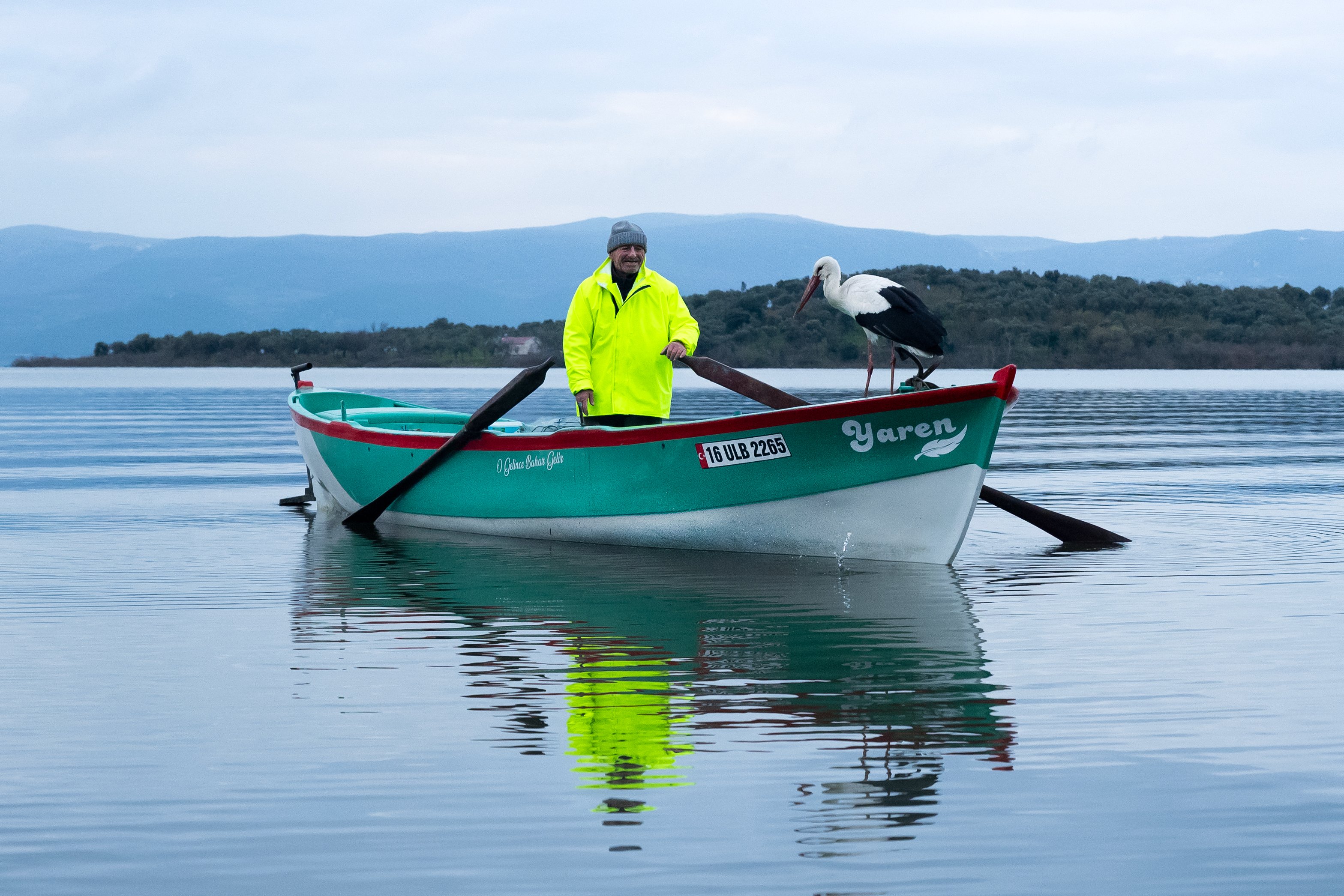 Yaren leyleğin, göl manzaralı yuvasının bulunduğu mahallede balıkçı Yılmaz'ın kayığındaki geleneksel pozu, doğa ve yaban hayatı fotoğrafçısı Alper Tüydeş tarafından kayda alındı.