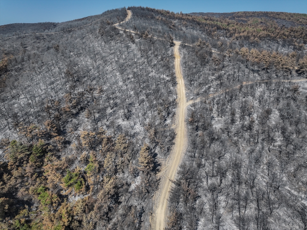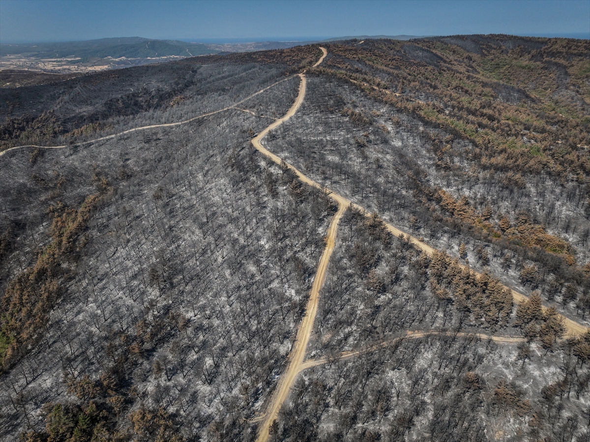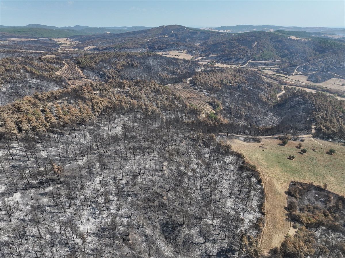 Çanakkale'nin Gelibolu ilçesinde kırsal alanda başlayıp ormana sıçrayan ve büyük ölçüde kontrol altına alınan yangında zarar gören alanlar dronla görüntülendi.