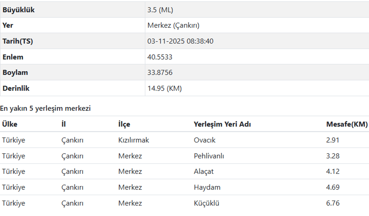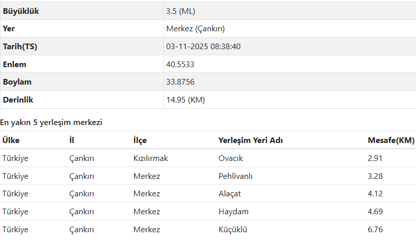 3 Kasım AFAD ve Kandilli Rasathanesi son depremler listesi Çankırı deprem verileri şöyle;