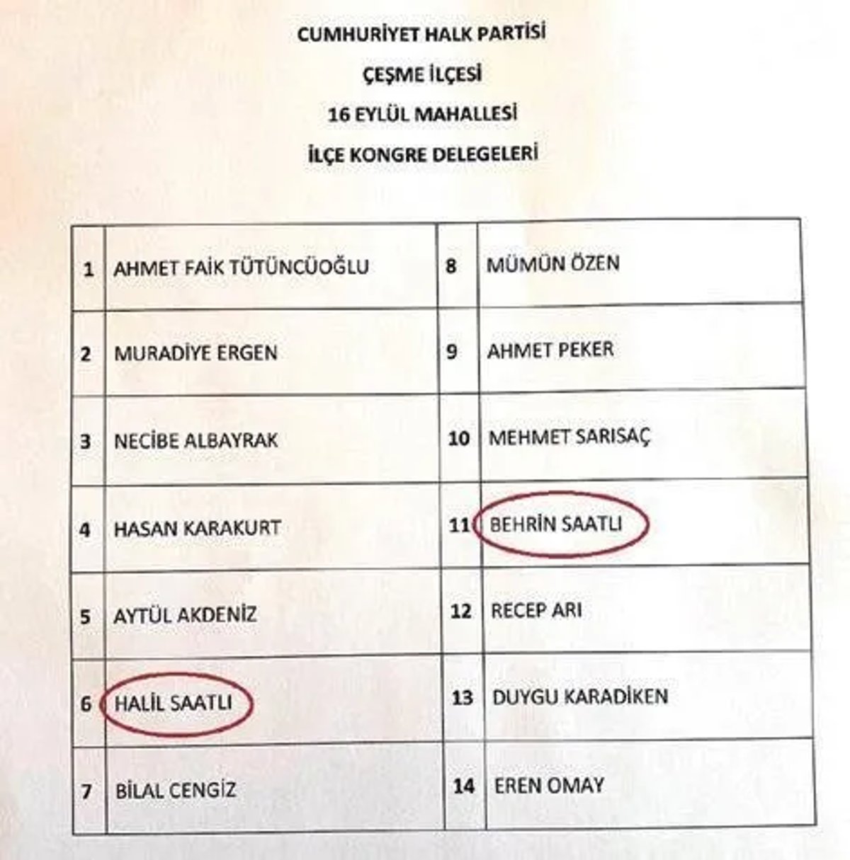 - CHP Çeşme Belediye Meclis Üyesi Onur Saatli, 16 Eylül Mahallesi delege listesine eşini, annesini, babasını ve kuzenini yazdırdı.
