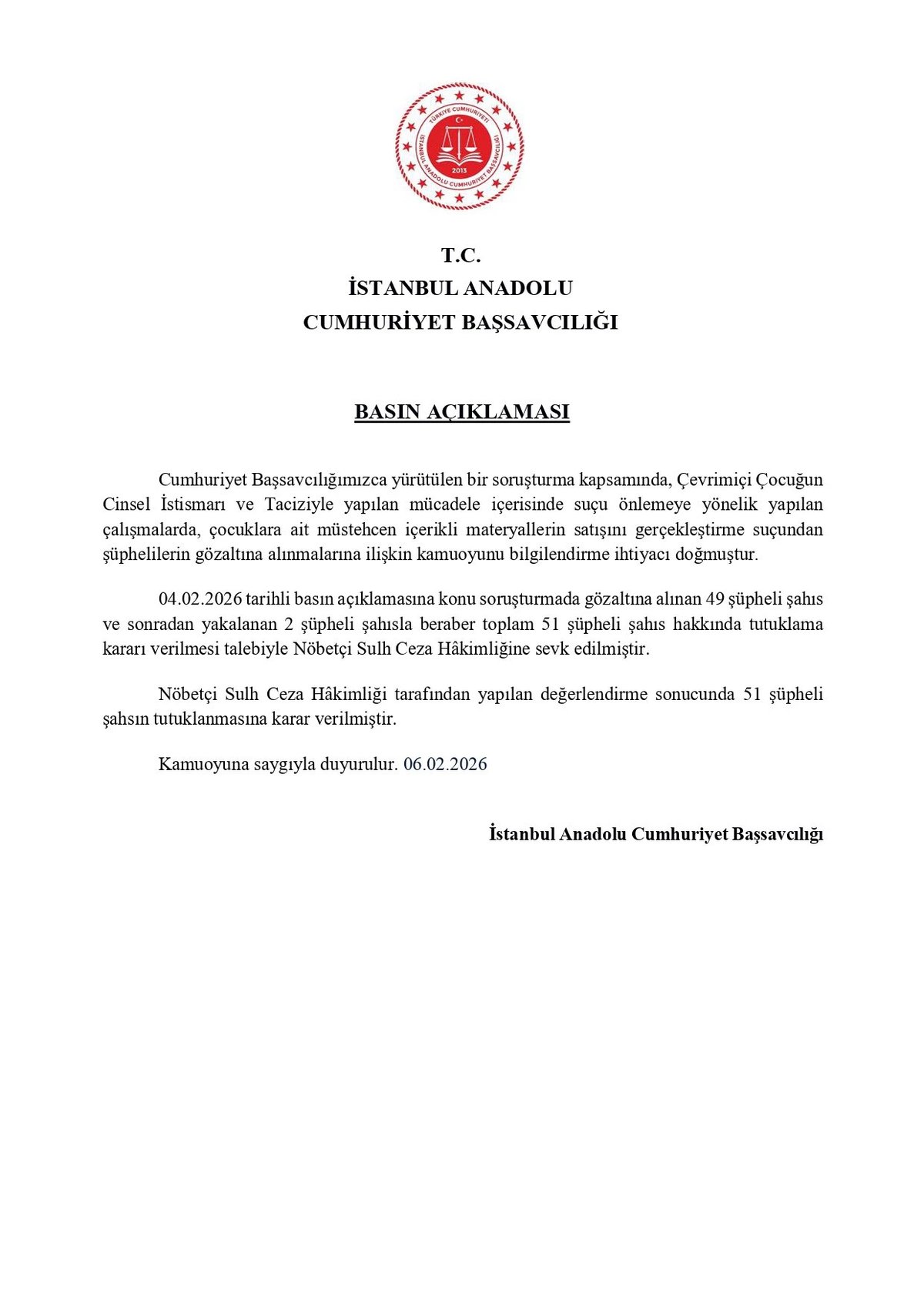 Cumhuriyet Başsavcılığınca yürütülen çalışmalar, çevrimiçi ortamda çocukların cinsel istismarına yönelik materyal satışını önlemeyi hedefledi. 4 Şubat tarihli ilk operasyonda 49 şahıs gözaltına alınırken, devam eden süreçte yakalanan 2 şüpheliyle beraber dosya kapsamında işlem gören kişi sayısı 51 oldu.