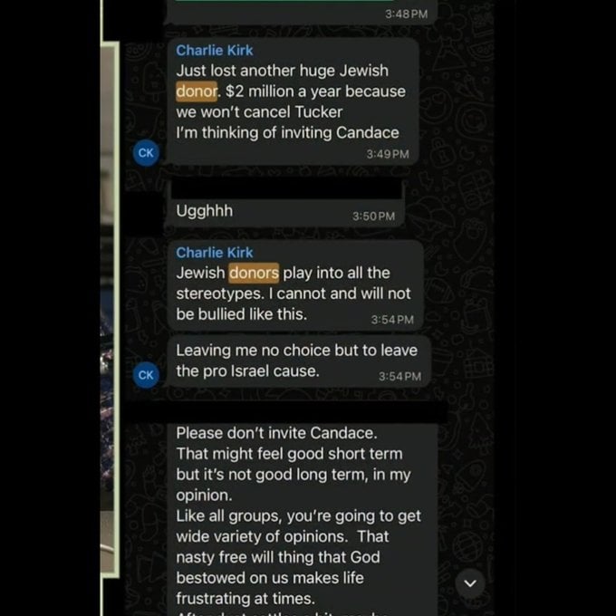 - Mesajlarda Kirk’ün “Yahudi bağışçılar baskı kuruyor” ifadeleri dikkat çekti.