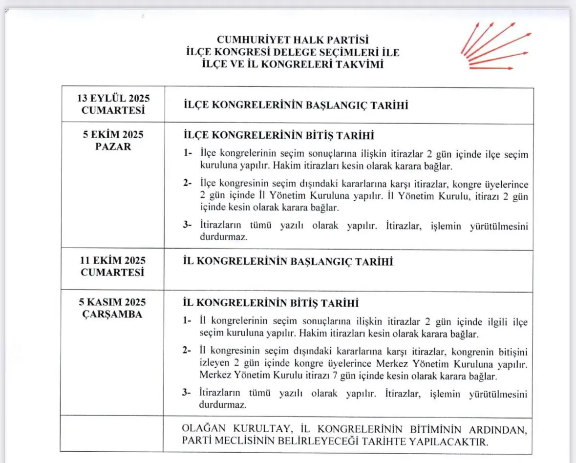 CHP 14 Temmuz itibarıyla kongreler takvimini başlattı. İlçe ve il kongrelerinin tamamlanmasının ardından, CHP’nin 39. Olağan Kurultayı, Kasım 2026’dan önce yapılacak.