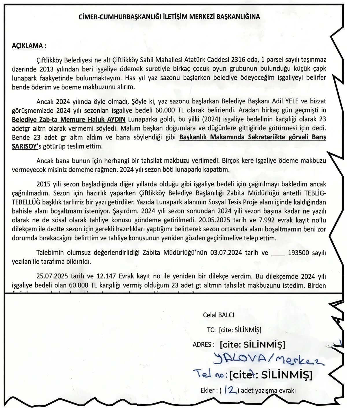Bu talep üzerine istenilen miktarı kendi imkanlarıyla temin eden Balcı, 23 adet gram altını doğrudan belediye başkanlık makamında görevli olan personele elden teslim etti. Teslimat anında kendisine hiçbir makbuz verilmemesi üzerine şüphelenen esnaf, defalarca yazılı ve sözlü olarak tahsilat makbuzu talep etmesine rağmen bu isteği tamamen karşılıksız bırakıldı.