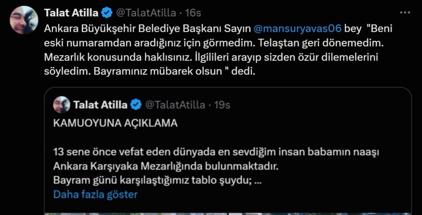 Atilla, sosyal medya hesabından yaptığı son paylaşımda ise kendisini Ankara Büyükşehir Belediye Başkanı Mansur Yavaş’ın aradığını söyleyerek, "Beni eski numaramdan aradığınız için görmedim. Telaştan geri dönemedim. Mezarlık konusunda haklısınız. İlgilileri arayıp sizden özür dilemelerini söyledim. Bayramınız mübarek olsun" ifadelerini kullandı.