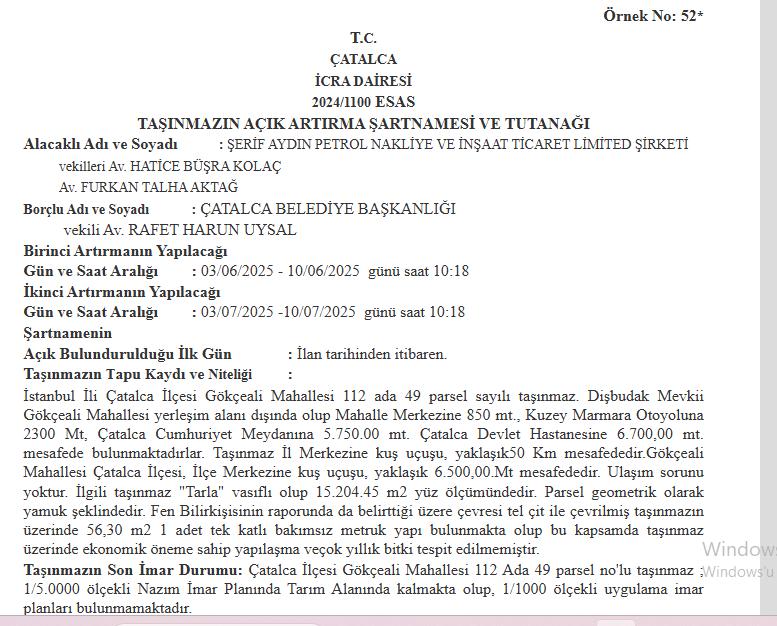 Taşınmaz Mahalle yerleşim alanı dışında bulunmaktadır. Parsel geometrik olarak yamuk şeklindedir. Fen Bilirkişisinin raporunda da belirttiği üzere çevresi tel çit ile çevrilmiş taşınmazın üzerinde 56,30 m2 1 adet tek katlı bakımsız metruk yapı bulunmakta olup bu kapsamda taşınmaz üzerinde ekonomik öneme sahip yapılaşma, çok yıllık bitki tespit edilmemiştir." ifadeleri kullanıldı. Ayrıca, "Çatalca İlçesi Gökçeali Mahallesi 112 Ada 49 parsel no'lu taşınmaz; 1/5.0000 ölçekli Nazım İmar Planında Tarım Alanında kalmakta olup, 1/1000 ölçekli uygulama imar planları bulunmamaktadır" bilgisi de ilanda yer aldı.