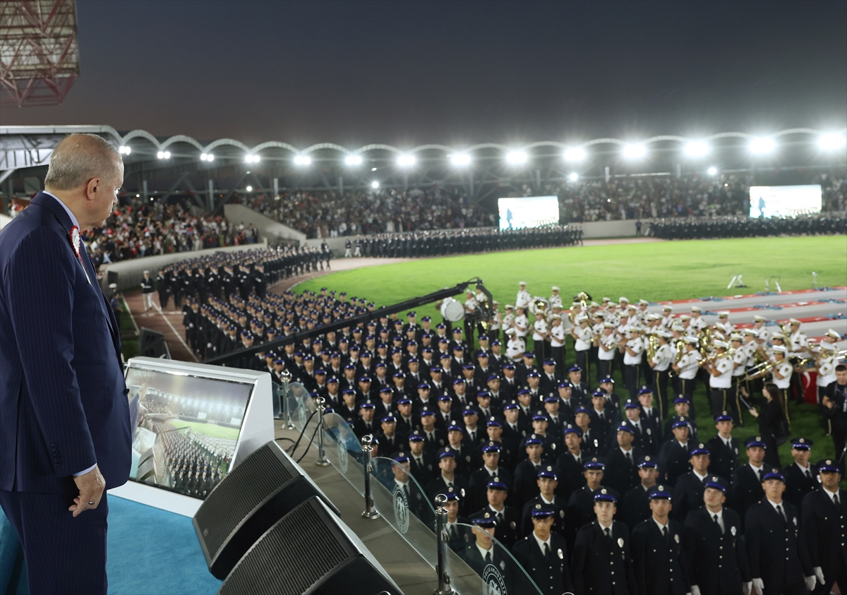 "Nazlı hilalin gölgesinde, ezanı Muhammedilerin huzurunu veren ikliminde 86 milyon hep birlikte güven içinde kardeşçe yaşayacağız," diyen Erdoğan, hiçbir sabotaj, hiçbir tahrik, hiçbir tuzağın Türkiye'yi girdiği bu tarihi yoldan geri döndüremeyeceğini vurguladı. Konuşmasının sonunda, mezuniyet sevinci yaşayan 8 bin 238 polisi ve gönül coğrafyasının farklı köşelerinde ülkelerine hizmet edecek 32 yabancı polisi tebrik etti.