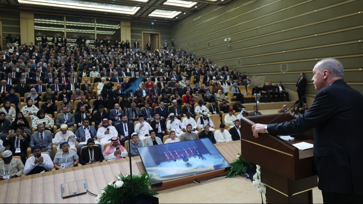 İslam aleminin bugün geçmişte hiç olmadığı kadar derin bir sarsıntıdan, çetin bir sınavdan, adeta bir varlık yokluk imtihanından geçtiğini vurgulayan Erdoğan, "Kitabullah'a sımsıkı tutunmamız, Allah'ın ipine dört elle sarılmamız, peygamber efendimizin sünnetini kendimize rehber edinmemiz gereken zorlu bir süreci hep birlikte tecrübe ediyoruz." dedi.