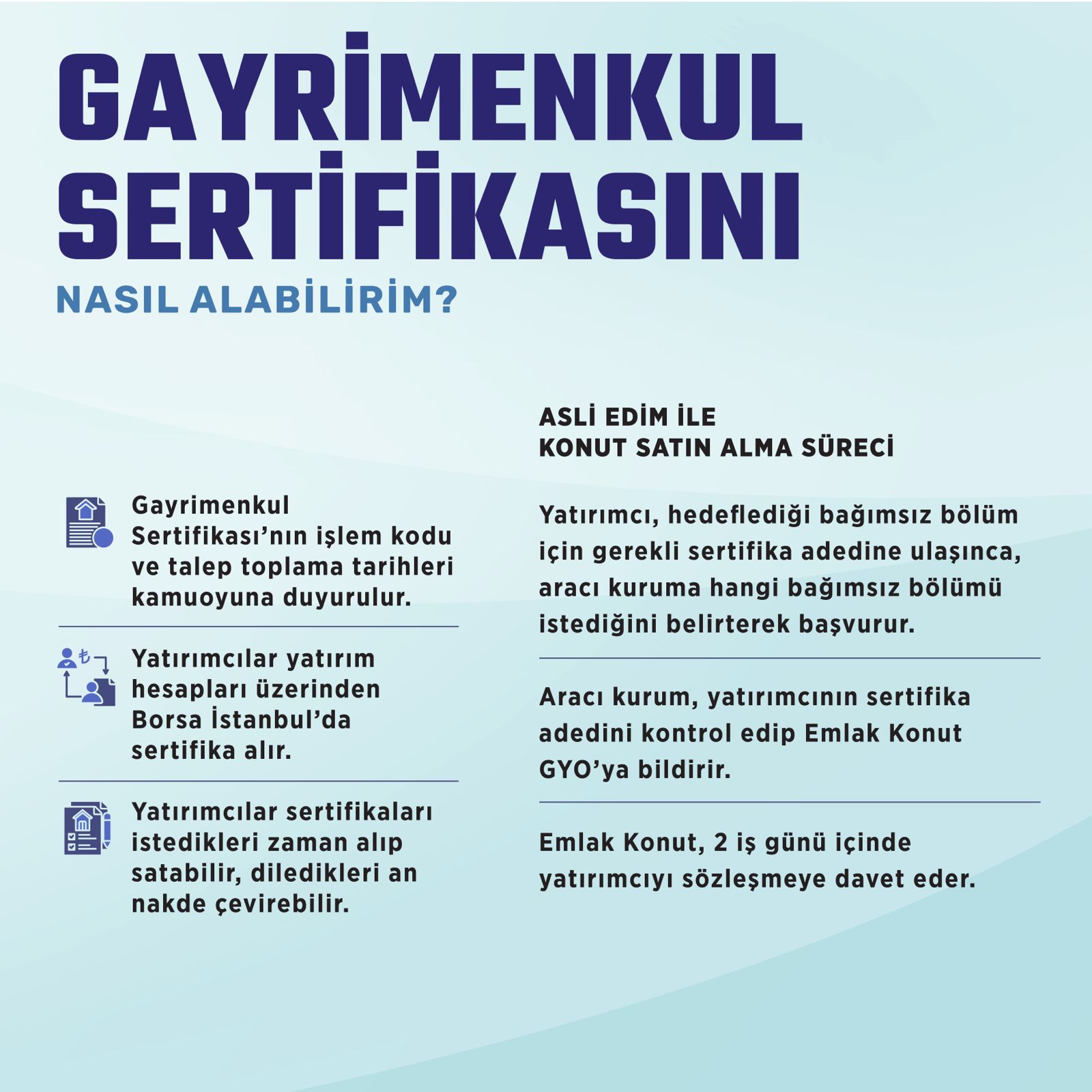 - Vatandaşlara Asli Edim (konut satın alma), Tali Edim (değer artışından pay alma) ve Borsa İstanbul'da alım-satım olmak üzere üç farklı yatırım seçeneği sunulacak.
