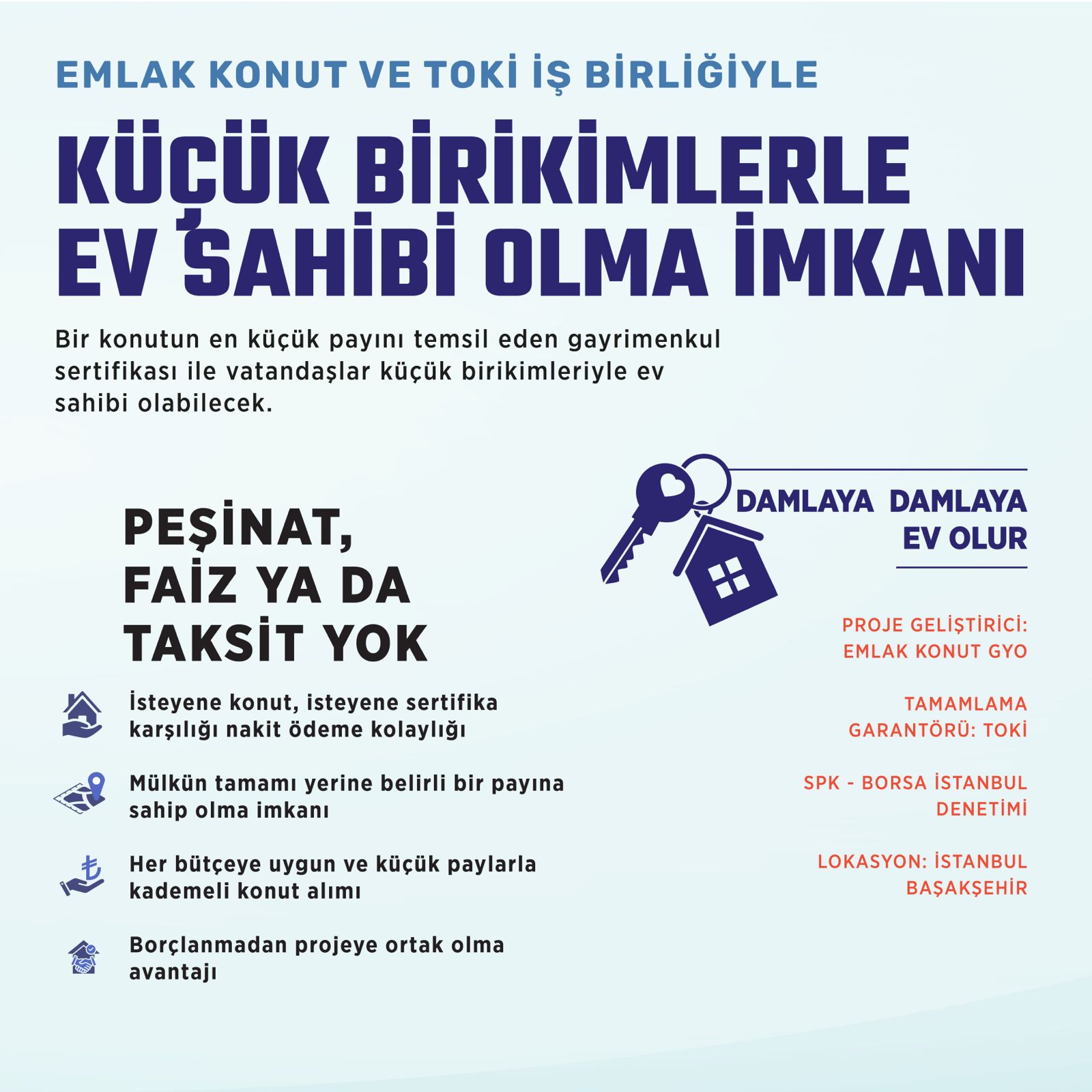 - Çevre, Şehircilik ve İklim Değişikliği Bakanlığı, TOKİ ve Emlak Konut GYO iş birliğiyle İstanbul Başakşehir’de Damla Kent Evleri Projesi'ni gayrimenkul sertifikası modeliyle hayata geçiriyor.