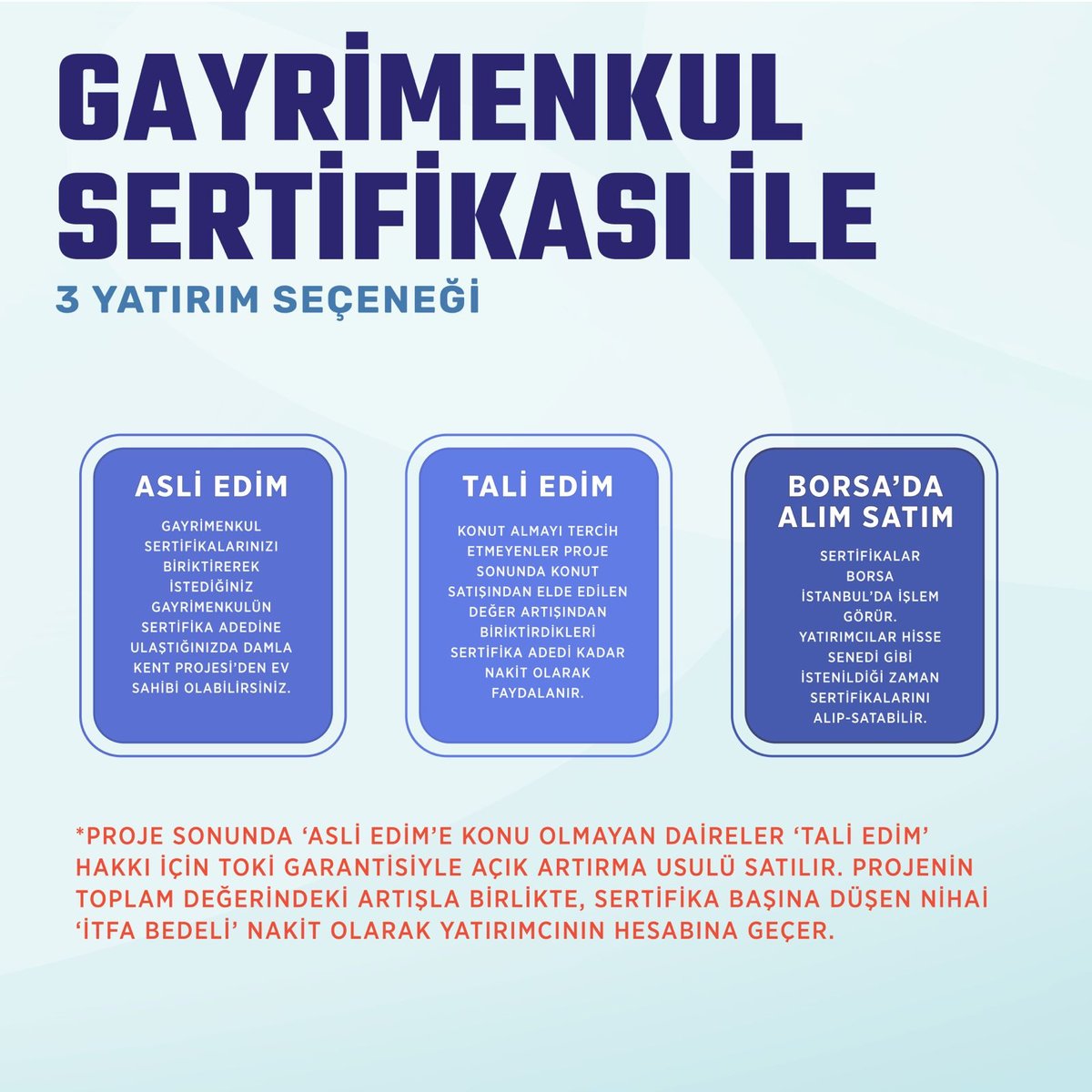 Damla Kent Evleri Projesi kapsamında, vatandaşlara üç ayrı yatırım seçeneği sunuluyor: İsteğe bağlı olarak sertifika biriktirerek doğrudan konut satın alma (Asli Edim), konut satın almak yerine gayrimenkul satışından sertifika sayısı oranında nakit faydalanma (Tali Edim) veya sertifikalarını Borsa İstanbul’da dilediği zaman alıp-satma imkanı. Bu esneklik, her bütçeye uygun konut alımının önünü açıyor ve borçlanmadan projeye ortak olma avantajı sunuyor.