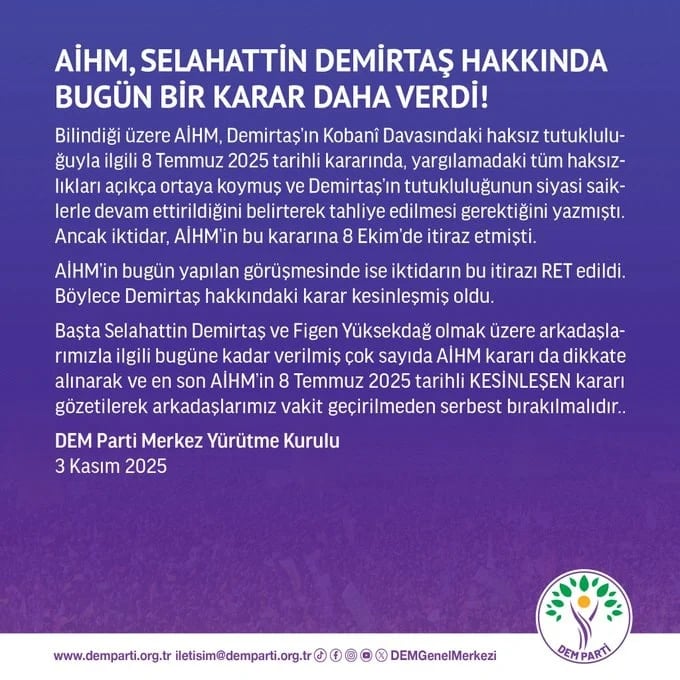 Kararın duyurulmasının ardından DEM Parti'den yazılı bir açıklama geldi. Açıklamada, AİHM'nin 8 Temmuz'daki kararı ve iktidarın bu karara itirazı hatırlatılarak, "AİHM'nin bugün yapılan görüşmesinde ise iktidarın bu itirazı reddedildi. Böylece Demirtaş hakkındaki karar kesinleşmiş oldu" denildi.
