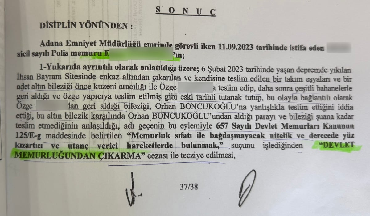 Adana'da depremde yıkılan binanın enkazından çıkan altınları, hayatını kaybedenlerin yakınlarına teslim ettikten sonra, "Savcılık geri istiyor, bütün altınlar toplandıktan sonra yeniden teslim edeceğiz" diyerek zimmetine geçirdiği tespit edilen polis memuru hakkında 2 kez 'devlet memurluğundan çıkartma' cezası verildi.