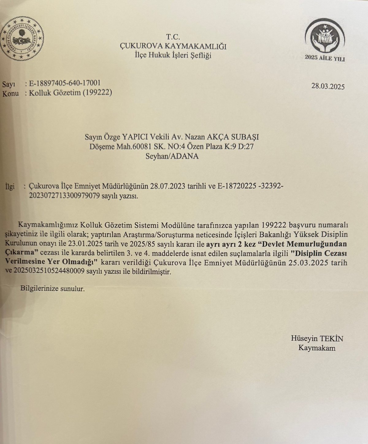Avukat Subaşı, polis memuru E.C. hakkında Adana Cumhuriyet Başsavcılığı'na suç duyurusunda bulundu. Ancak dönemin savcısı takipsizlik kararı verdi. Bunun üzerine avukat Subaşı, savcının verdiği takipsizlik kararı üzerine Sulh Ceza Mahkemesi'ne başvurdu ve dönemin savcısının verdiği karar kaldırılıp soruşturma izni verildi. Bunun üzerine Emniyet Genel Müdürlüğü konuyla ilgili müfettiş görevlendirdi.