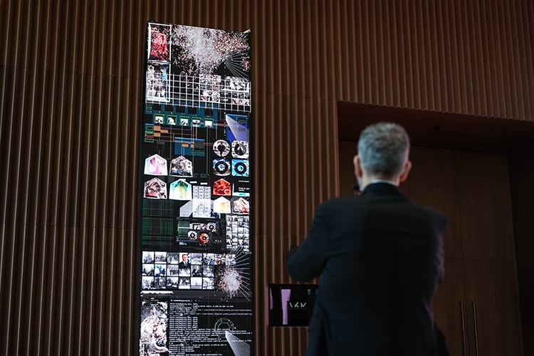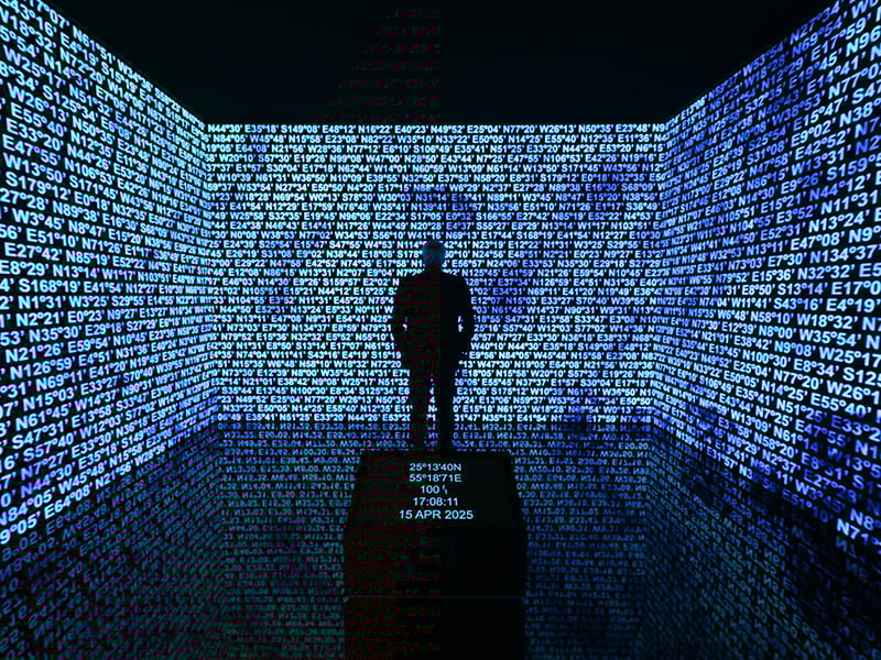 Julius Baer Lounge’a girildiğinde, dalgaların sesi eşliğinde, sayısal koordinatlarla çevrili sonsuz bir alan hissi yaratır. Yön duygusu olmayan, karmaşık bir dünya haritası gibi, neredeyse kara izinin olmadığı geniş bir okyanusta kaybolma hissi yaşatır. Bu koordinatlar, suyun kıyıyla buluştuğu yerleri gösterir. Emirlikli sanatçı Mohammed Kazem’in Art Dubai’deki ilk enstalasyonu olan bu eser, sınırsız coğrafya fikrini destekler. “Yönler (Birleşme)” adlı çalışma, kaynakların dönüşümünü, doğanın akışkanlığını ve uzak kıyıların bağlılığını anlatırken, Dubai’nin gelecekte küresel bir merkez olarak gelişimini yansıtır.
