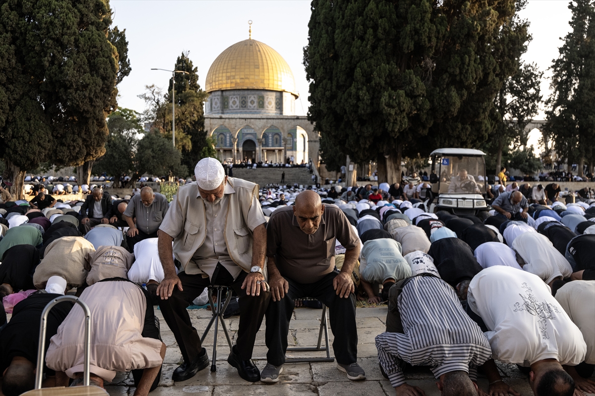 İsrail’in getirdiği kısıtlamalara rağmen binlerce Filistinli, bayram namazını Mescid-i Aksa’da kıldı.
