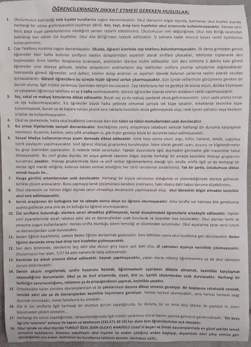 - Düzce Turgut Özal Anadolu Lisesi'nin 2025-2026 eğitim-öğretim yılı için velilere gönderdiği kurallar kamuoyunda tepki çekti.
