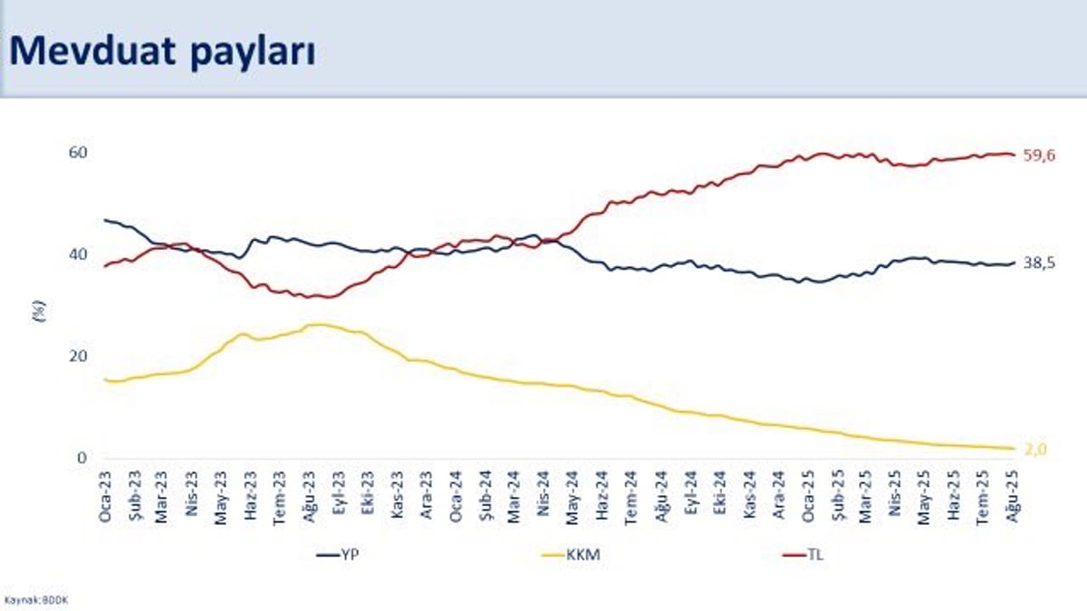 - Toplam mevduat içinde Türk Lirası'nın payı %59,6'ya yükselirken, Kur Korumalı Mevduat'ın (KKM) payı %2,0'ye geriledi.