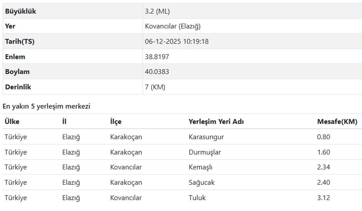 AFAD verilerine göre ise merkez üssü Kovancılar olan 3.2 şiddetindeki deprem saat 10.39'da yerin 7 kilometre derinliğinde meydana geldi.