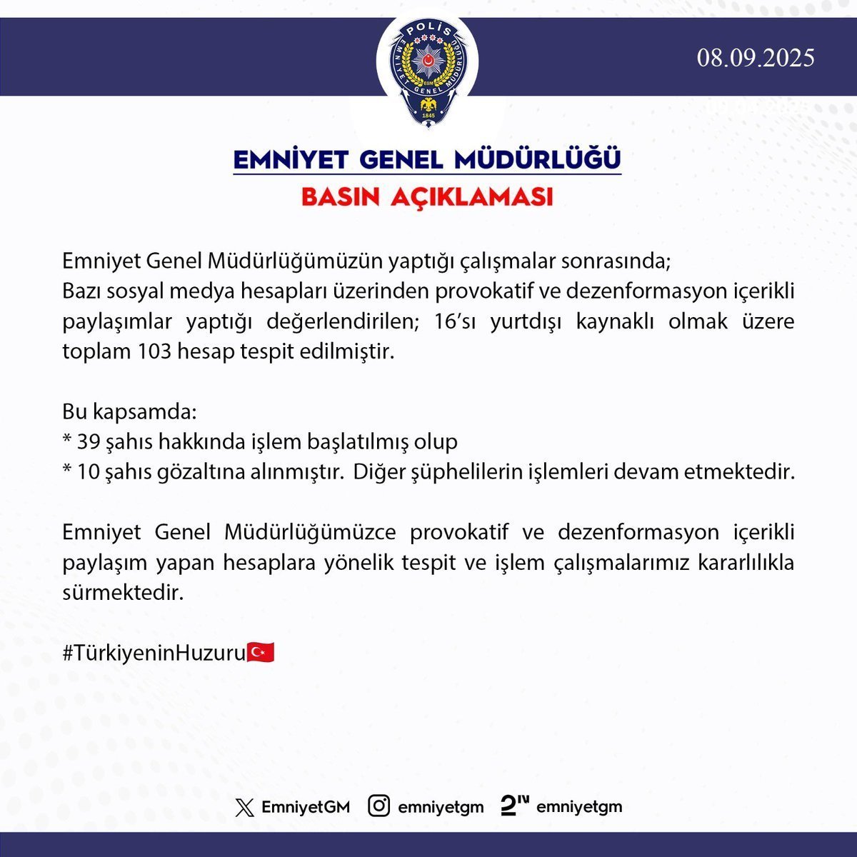 - Emniyet Genel Müdürlüğü, provokatif ve dezenformasyon içerikli paylaşımlar yapan 103 sosyal medya hesabını tespit etti.