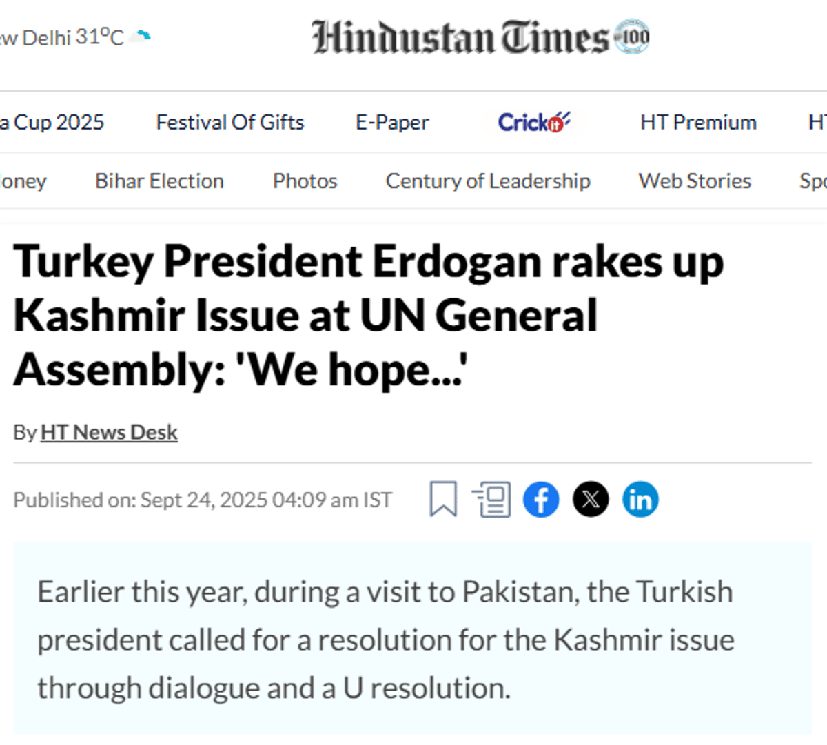 Hindustan Times, Cumhurbaşkanı Erdoğan’ın Keşmir meselesini gündeme getirdiğini yazdı. Haberde Cumhurbaşkanı Erdoğan’ın, Hindistan-Pakistan ilişkilerinde sağlanan ateşkesten memnuniyetini dile getirdiğini ve Keşmir halkının çıkarları doğrultusunda diyalog yoluyla çözüm sağlanması gerektiğini vurguladığını belirtti.