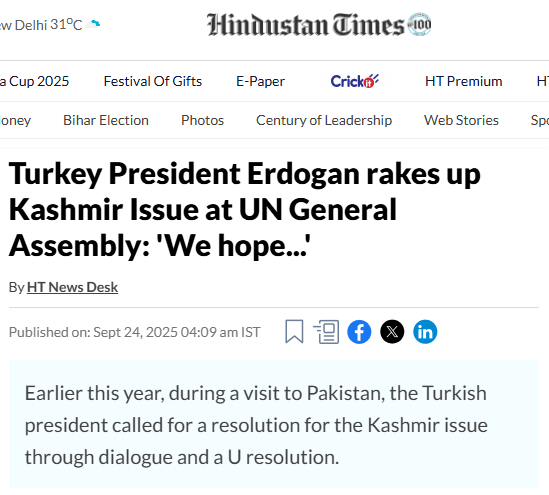 - Hindustan Time, Cumhurbaşkanı Erdoğan’ın Keşmir konusundaki çağrılarını dünya kamuoyuna yansıttı.