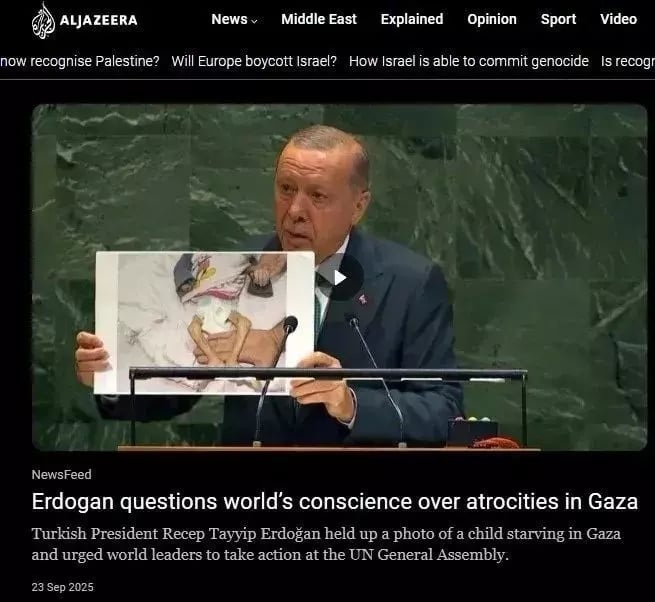 Katar merkezli El Cezire, Cumhurbaşkanı Erdoğan’ın Gazze’de açlıktan ölen bir çocuğun fotoğrafını göstererek, dünya liderlerini acilen harekete geçmeye çağırdığını aktardı ve "Başkan Erdoğan'ın, Gazze'deki vahşet konusunda dünyanın vicdanını sorguladığını" yazdı.