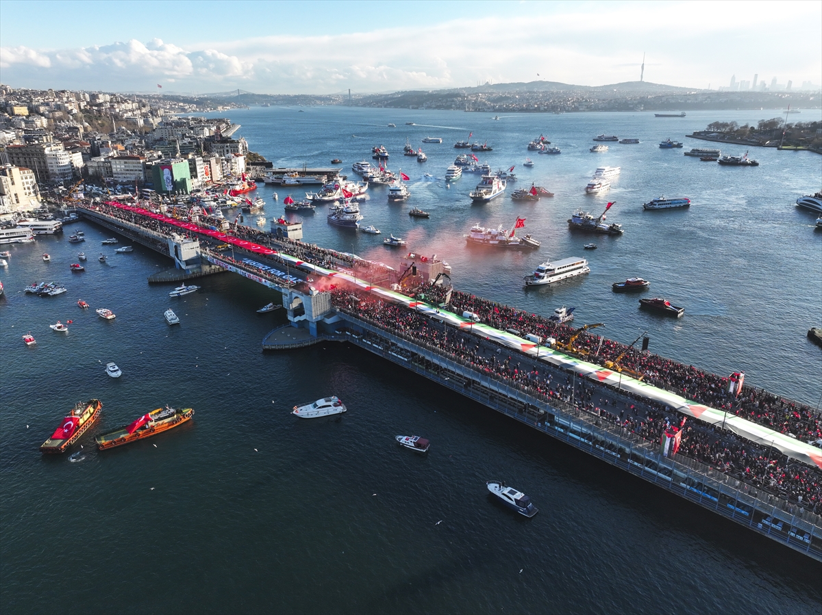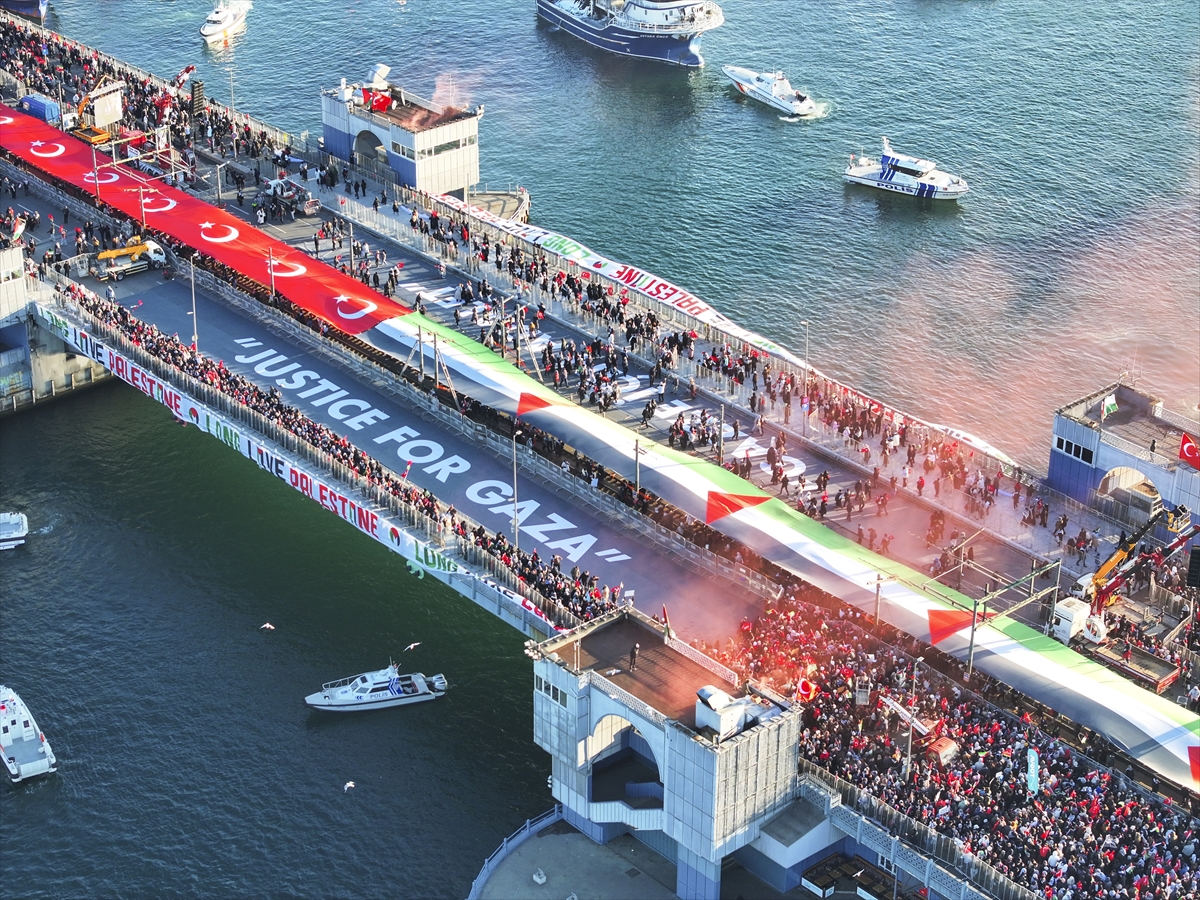 İstanbul’da Filistin’e destek için düzenlenen yürüyüş, sabah namazının ardından tarihi camilerden başlayan kortejlerin Galata Köprüsü’nde buluşmasıyla görsel bir şölene dönüştü. Galata Kulesi’nden ve havadan görüntülenen binlerce kişilik kalabalık, İstanbul siluetiyle birleşti.