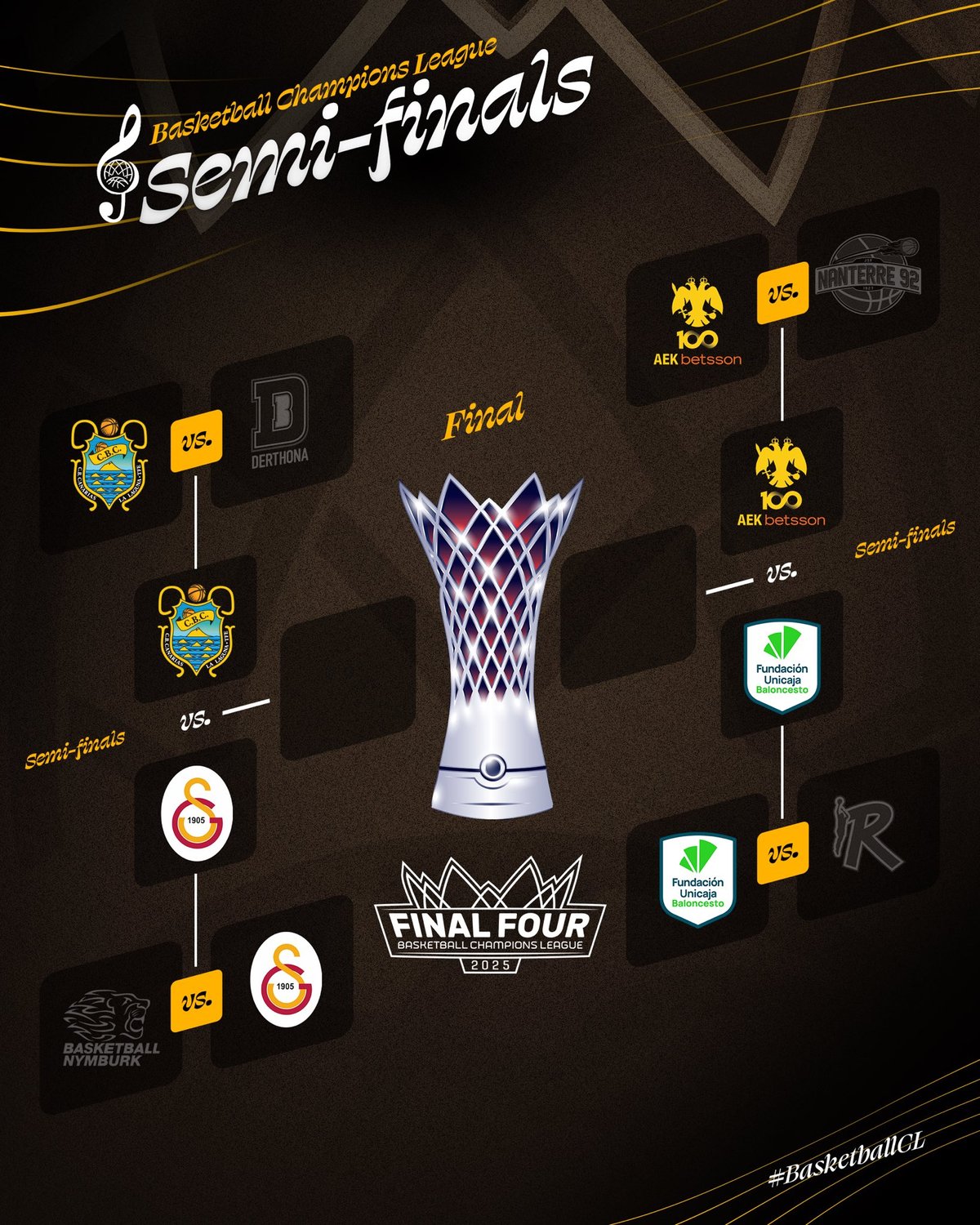 Galatasaray, Basketbol Şampiyonlar Ligi Final Four etabında 9 Mayıs Cuma günü Tenerife ile Atina'da karşılaşacak. Turnuvanın diğer yarı finalinde ise AEK ile Unicaja karşılaşacak.