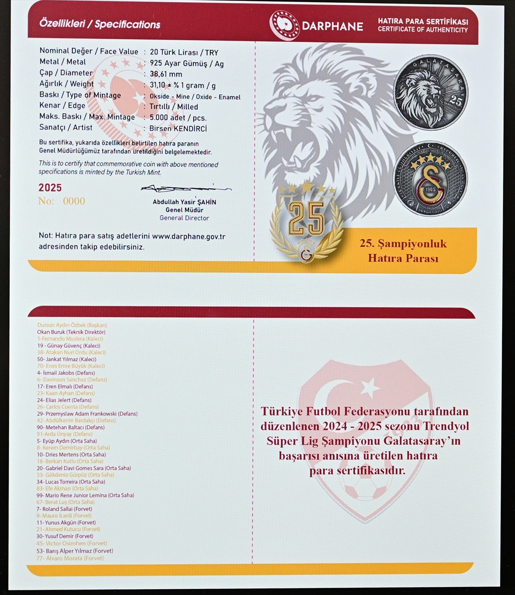 Galatasaray Futbol Takımı'nın 2024-2025 sezonunda Süper Lig'de üst üste üçüncü, toplamda 25. şampiyonluğunu kazanması üzerine Darphane ve Damga Matbaası Genel Müdürlüğü harekete geçti. Sarı kırmızılı ekibin bu tarihi başarısı için özel olarak tasarlanan hatıra parası, 925 ayar gümüşten üretilecek. 5 bin adet basılacak olan bu özel para, 38,61 milimetre çapında ve 31,10 gram ağırlığında olacak. Yüksek koleksiyon değeri taşıyan bu özel basım, 2 bin 250 liradan satışa sunulacak.