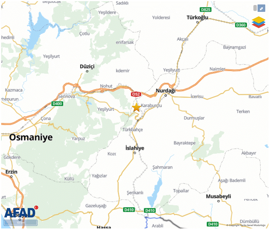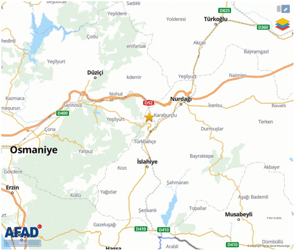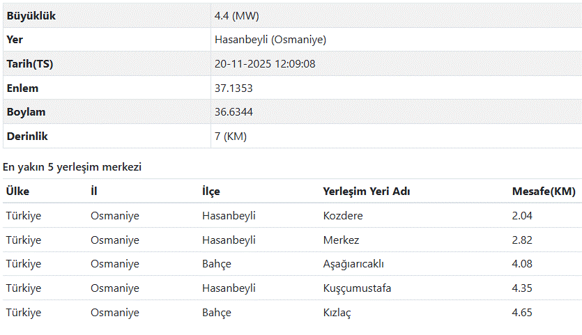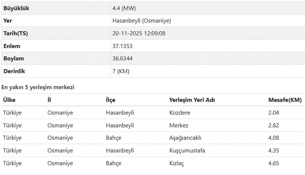 AFAD verilerine göre ise yerin 7 kilometre derinliğinde meydana gelen 4.4 şiddetindeki depremin merkez üssü Osmaniye Hasanbeyli olarak duyuruldu.
