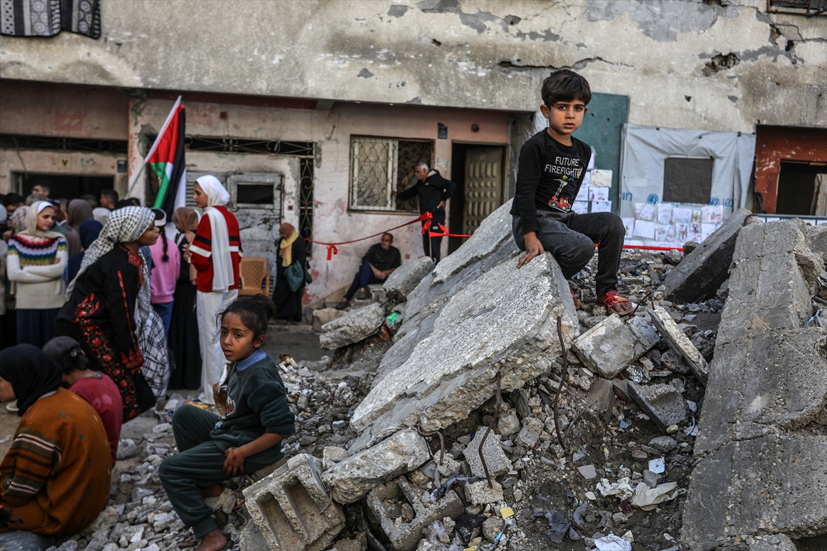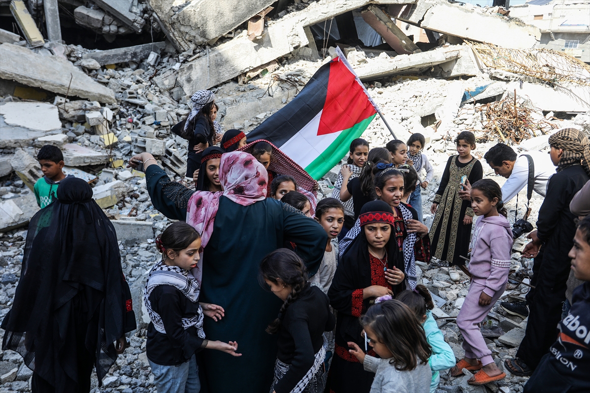 Gazzeli çocuklar, Dünya Çocuk Hakları Günü’nü İsrail’in saldırılarında enkaza dönen binaların arasında ellerindeki Filistin bayraklarıyla kutladı.