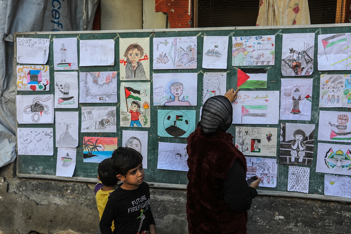Gazze Şeridi’nin güneyindeki Han Yunus kentinde, İsrail ordusunun yıkıma uğrattığı evlerin enkazı arasında çocukların savaş sırasında yaşadıkları psikolojik durumu ve Filistin kültürel mirasını yansıtan resimlerinin yer aldığı bir etkinlik düzenledi.