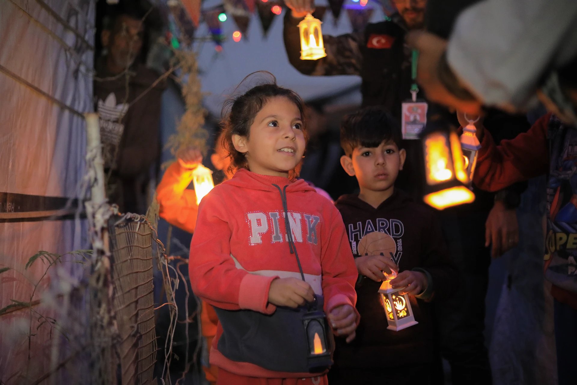 Hediye edilen ışıklı fenerleri ellerine alan çocuklar, çadır kentin dar yollarında yürüyerek renkli görüntüler oluşturdu.
