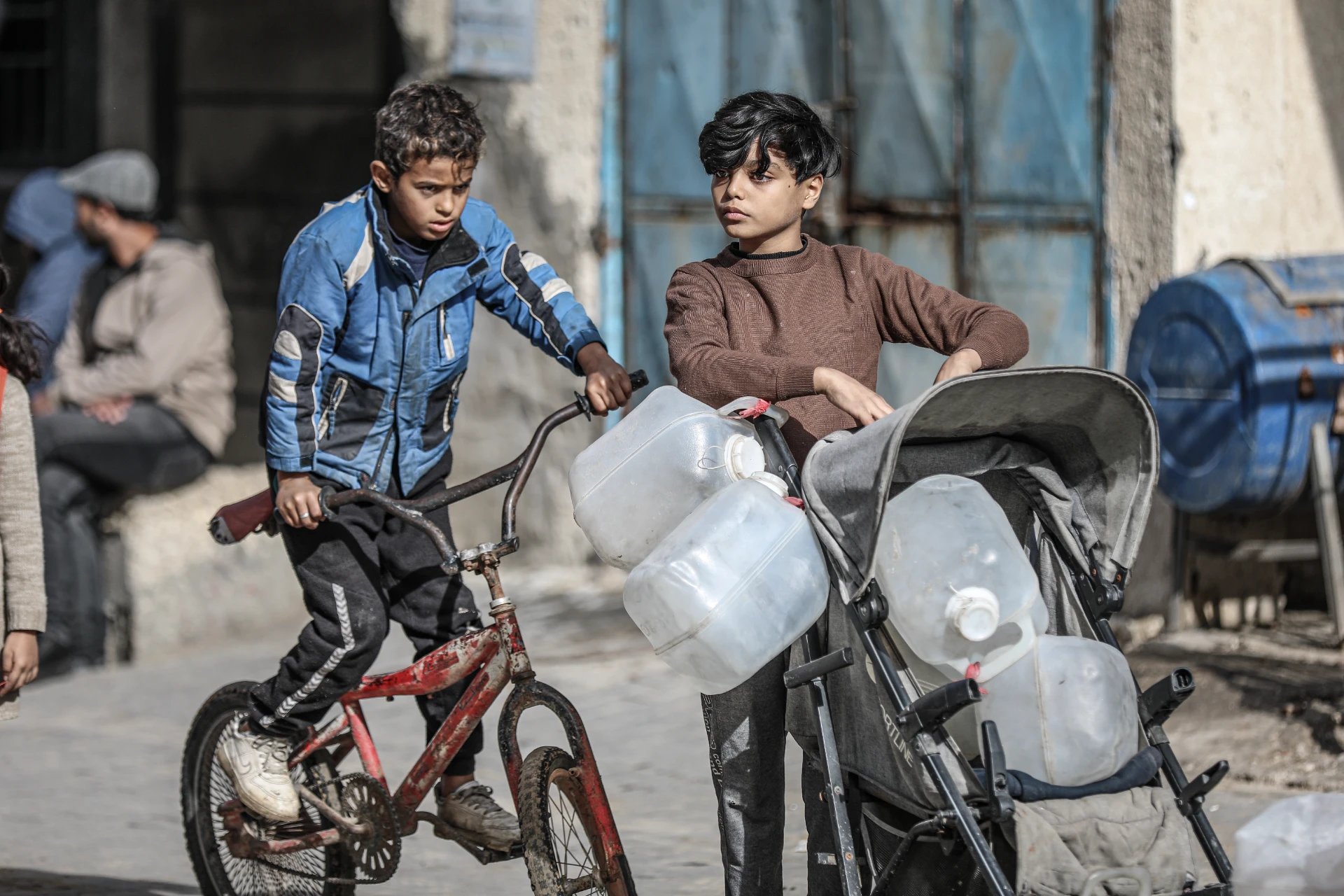 Nuseyrat Mülteci Kampı'nda altyapı çöküntüsü nedeniyle su krizi yaşanırken, aileler tankerlerden bidonlarla su taşımaya devam ediyor.