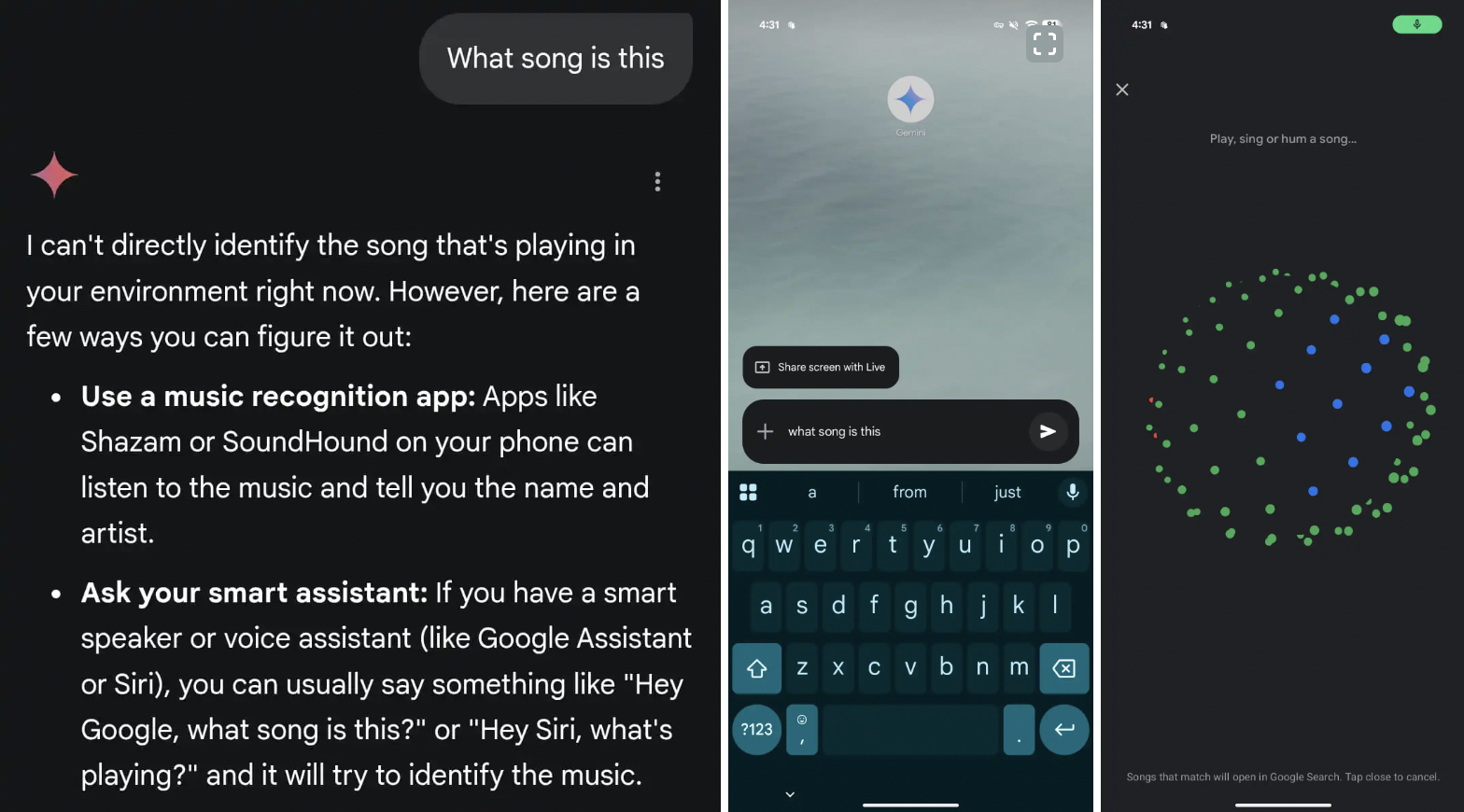 - Kullanıcılar, Gemini'a "Bu şarkı ne?" gibi sorular sorarak müzik tanıma arayüzünü etkinleştirebiliyor ve çalınan, mırıldanılan veya söylenen şarkıları belirleyebiliyor.