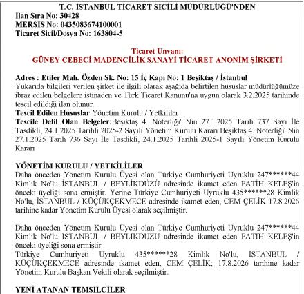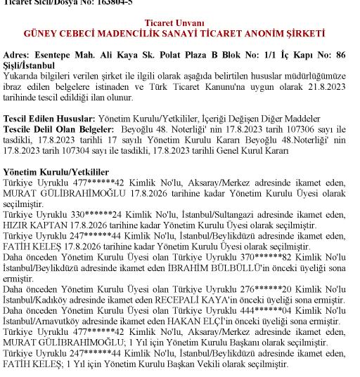 Ticaret Sicil Gazetesinde yayınlanan ilana göre, Güney Cebeci Madencilik şirketinin Yönetim Kurulu Başkanı Murat Gülibrahimoğlu, Başkan Vekili Fatih Keleş, Yönetim Kurulu üyeleri Hızır Kaptan, İbrahim Bülbüllü, Recep Ali Kaya ve Hakan elçi isimlerinden oluştu. Yönetim Kurulu görev tanımlarının süresinin bir yıl olarak belirlenmiş.