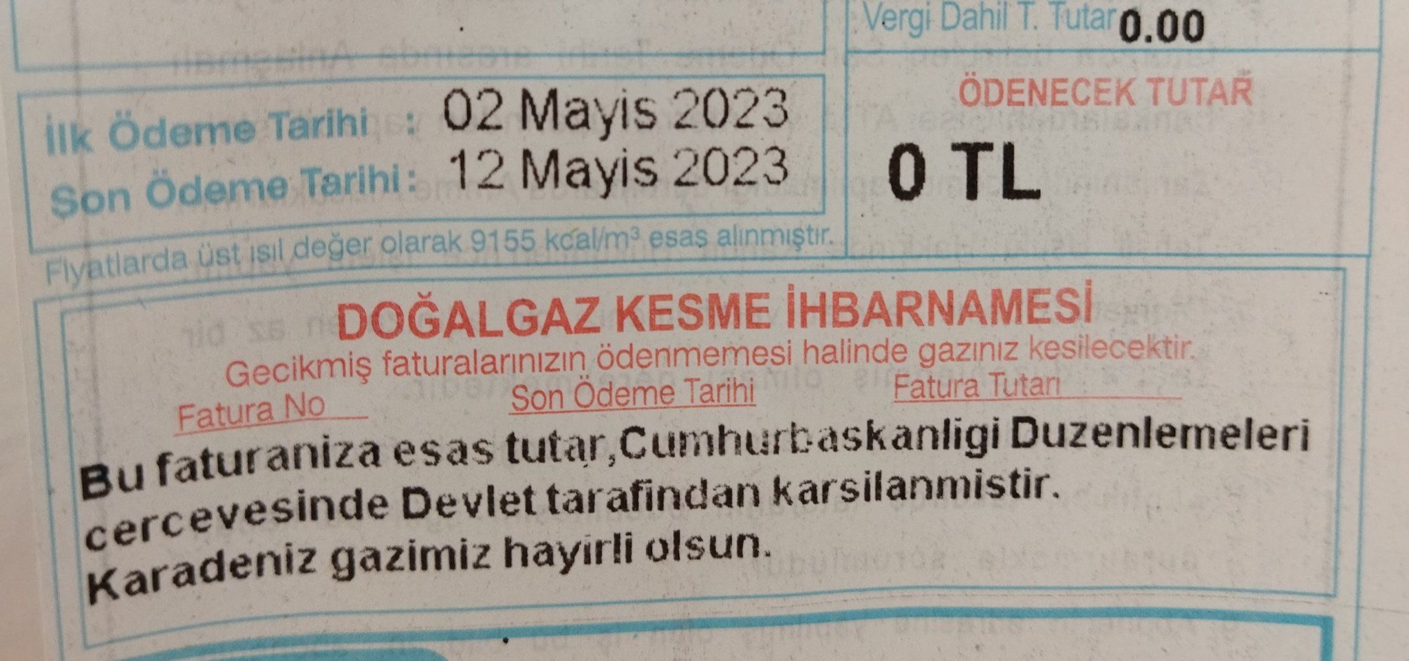 Doğalgaz faturaları, ''Bu faturanıza esas tutar, Cumhurbaşkanlığı Düzenlemeleri çerçevesinde Devlet tarafından karşılanmış. Karadeniz gazımız hayırlı olsun'' notu ile kesilmeye başlandı.