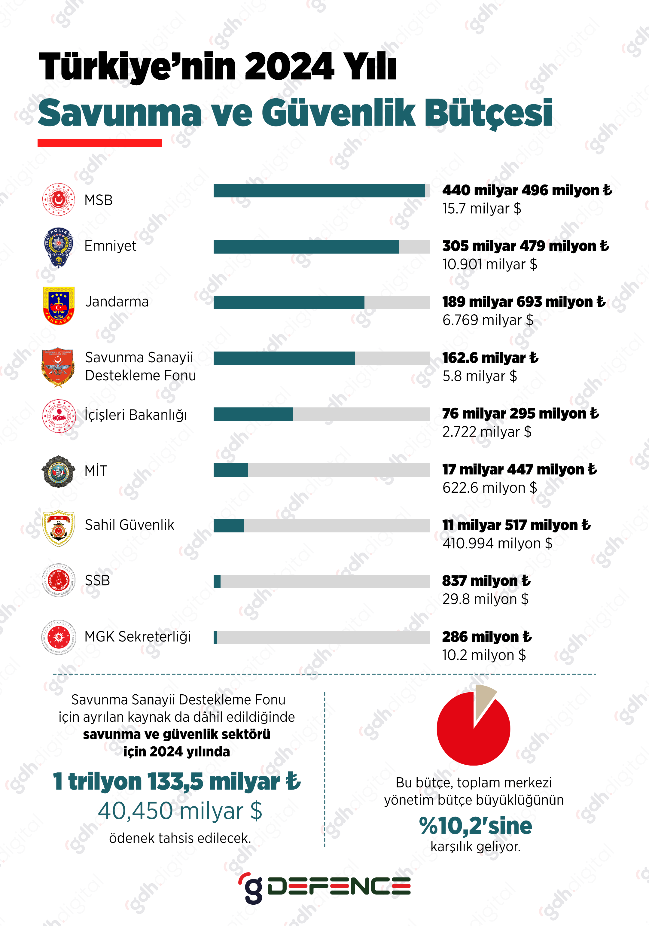 - Yetkililer tarafından geçtiğimiz günlerde belirlenen 2024 yılı Savunma ve Güvenlik Bütçesi ise 1 trilyon 133,5 milyar tl (40 milyar 450 milyon dolar) olmasıyla dikkat çekti.