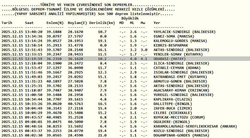 15 Aralık AFAD ve Kandilli Rasathanesi son depremler listesi ile son dakika Hatay deprem verileri şöyle;