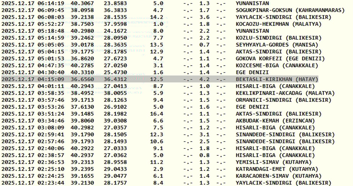 Hatay depremle sallandı | 17 Aralık AFAD ve Kandilli Rasathanesi son depremler listesi