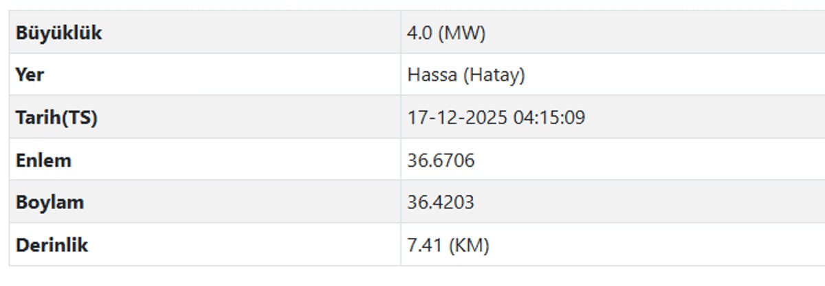 AFAD son depremler listesi verilerine göre ise 4.0 şiddetindeki deprem Hatay'ın Hassa ilçesinde meydana geldi.