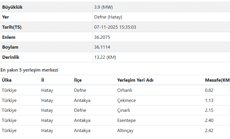 AFAD verilerine göre Hatay'ın Defne ilçesinde 3.9 şiddetinde bir deprem meydana geldi.