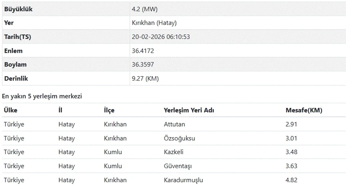 AFAD Hatay deprem verilerine göre ise 20 Şubat günü saat 6.10'da yerin 9.27 km derinliğinde meydana gelen sarsıntının şiddeti 4.2 olarak açıklandı.