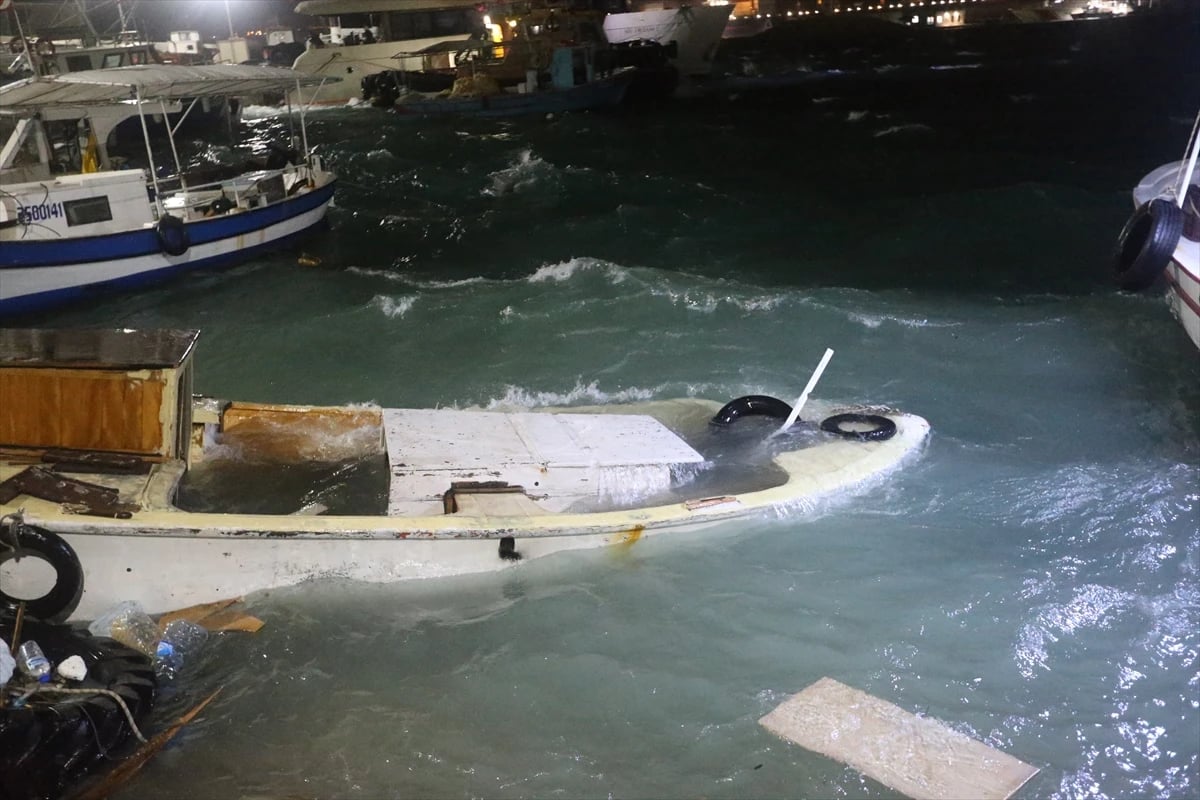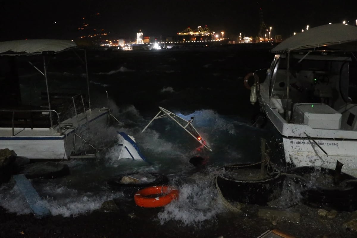 İskenderun Balıkçı Barınağı'nda demirli halde bulunan yedi tekne fırtınanın etkisiyle alabora oldu.