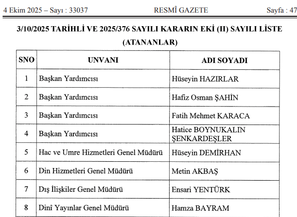 4 Ekim tarihli resmi gazete yer alan atama kararlarında Dr. Öğr. Üyesi Hatice Boynukalın Şenkardeşler Diyanet İşleri Başkanlığı Başkan Yardımcısı olarak atandığı duyuruldu. Açıklama sonrasında detaylar Hatice Boynukalın Şenkardeşler kimdir, nerelerde görev yaptı? soruları üzerinden araştırılmaya başlandı.
