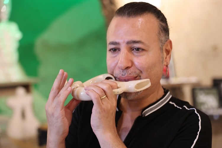 Nevşehir'in el sanatı ürünleriyle bilinen Avanos'ta, Terra Kapadokya Kadın Kooperatifi üyelerince Hitit dönemine ait seramik halkalı testi formu, geleneksel yapısına uygun enstrümanlara dönüştürülüyor.