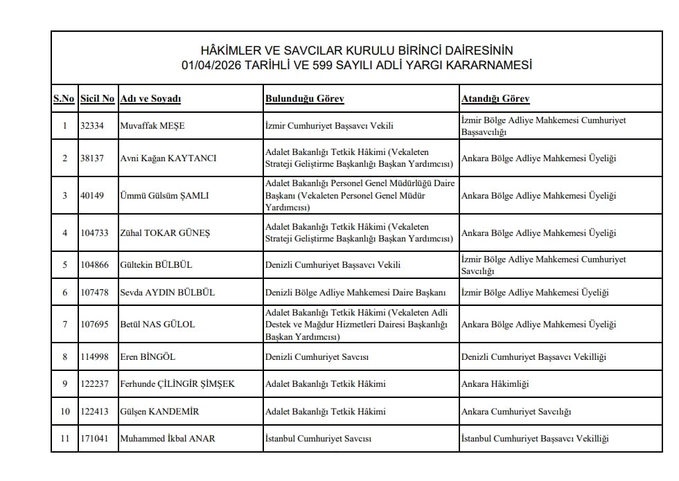 Hakimler ve Savcılar Kurulu (HSK) Birinci Dairesi tarafından yayımlanan yeni kararnameyle adli yargıda 11 hakim ve savcının görev yeri değişti.